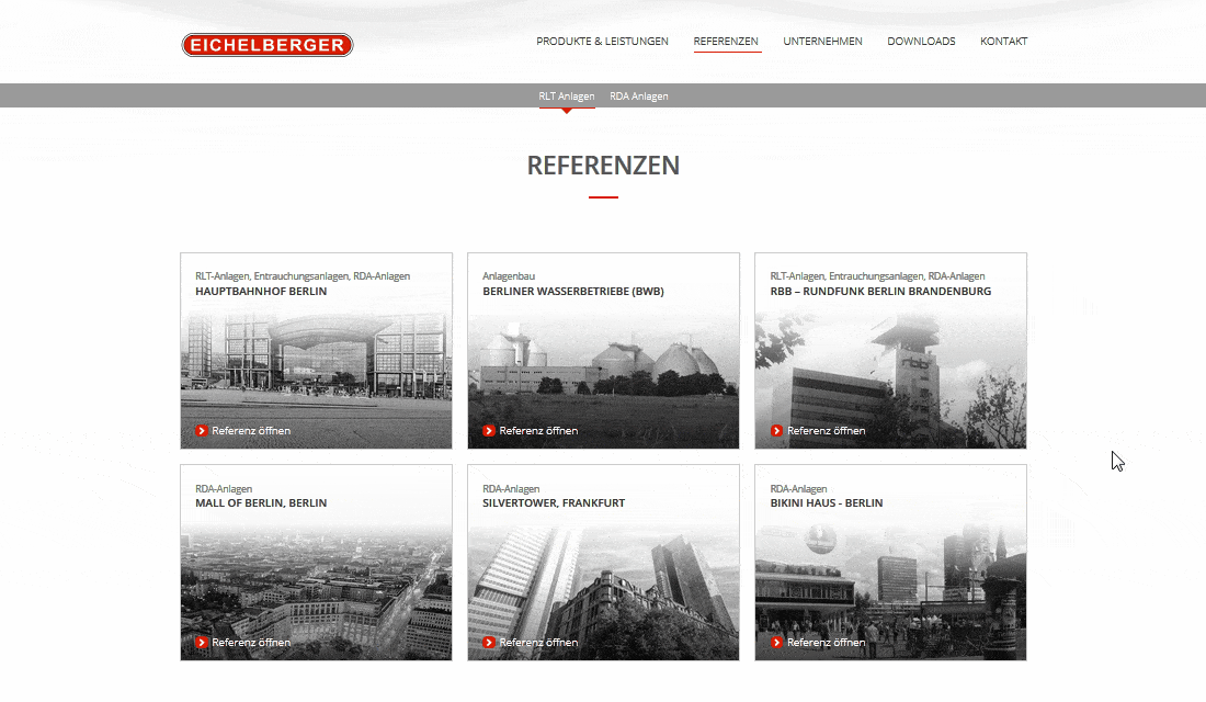 Sobald der Nutzer auf eine Referenz klickt, scrollt die Website automatisch nach oben und der Text blendet sich ein. Nach dem Schließen scrollt die Seite wieder zurück an ihre Originalposition.